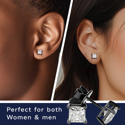 Black Moissanite Stud Earrings for Men, 2Carat Princess Cut Simulated Diamond S925 Sterling Silver Earrings